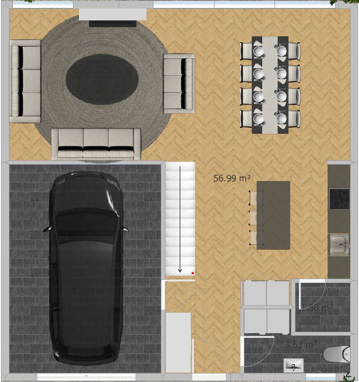 Na samom ulazu je wc u sklopu kojeg se nalazi i dizalica topline. Slijedi kuhinja s velikim kuhinjskim otokom i ostavom. Stepenište može ostati otvoreno ili se može zatvoriti knaufom i biti ostava. Iz garaže se ulazi u predsoblje. Open space čine velika blagovaonica sa stolom za xy ljudi, desno se može staviti vitrina ili police. Dnevni boravak ima dosta sjedećih mjesta, a na vanjskom zidu nalazi se kamin iznad kojeg je TV. Open space je doslovno okupan svjetlosti i prostran je boli glava.
