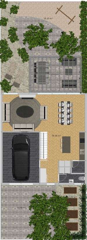 Popločan je i može služiti i za igru i za smjestiti maksimalno 3 auta. Zatim se nalazi dio s gustom živicom i ukrasnim stablima/ voćkama. Lijevo od ulaza može biti nisko spremište za bicikle/ guralice itd. Desno je pošljunčan dio za izač, zapalit na miru, da ti drugi ne skaču po glavi.