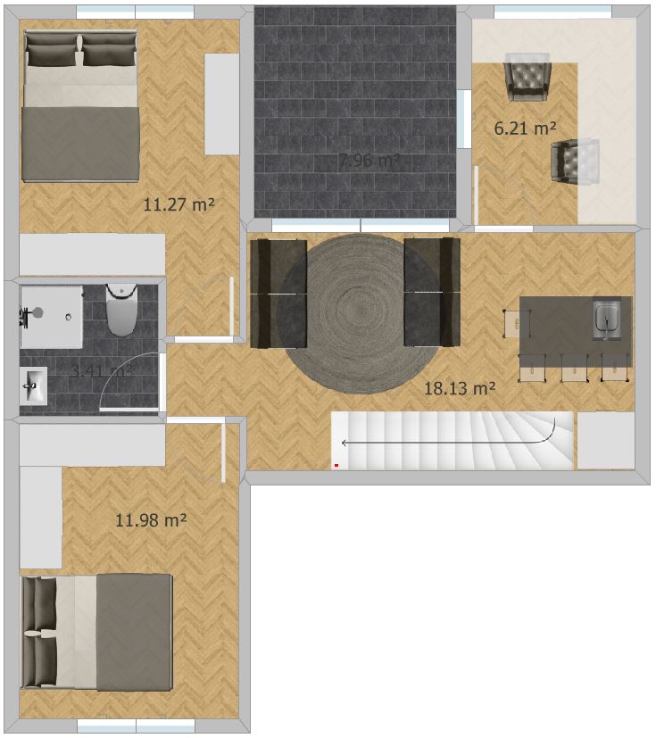 Kat ima dvije sobe i kupatilo te radnu sobu iz koje se izlazi na terasu. Cijelo predsoblje zamišljeno je kao prostor za druženje. Ima dva kauča te kuhinjski poluotok ispod koje je mali frižider i mali sudoper. Iznad može biti polica s par čaša i mikrovalna.