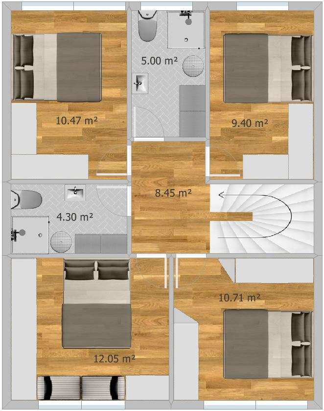 Na katu su čak 4 prostrane spavaće sobe- sve su uređene kao spavaće i to na različite načine kako bi se vidjelo koja bi soba od tih bila najpovoljnija za spavaću. Na katu se nalaze i dva kupatila koja imaju čak i prozore.