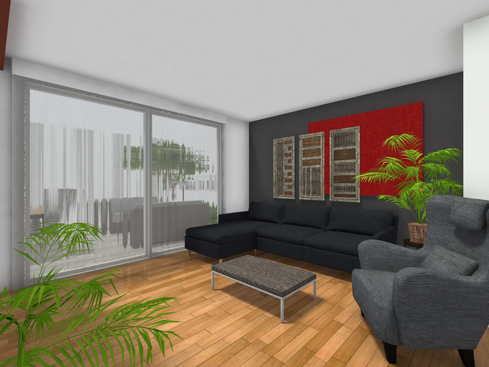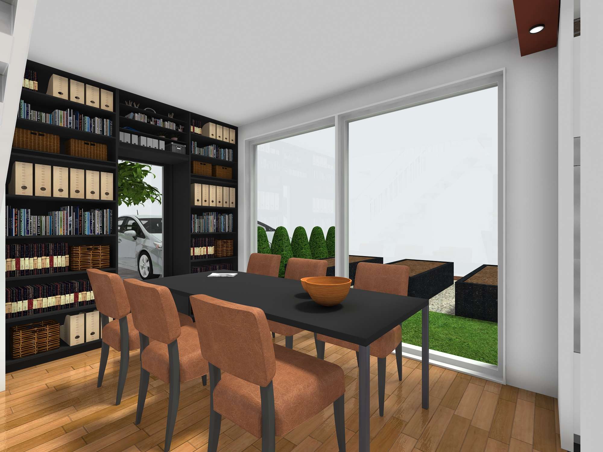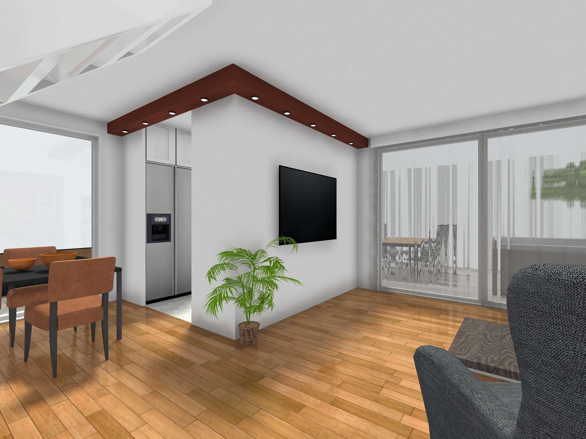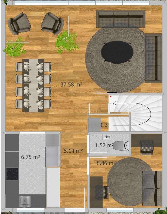 U hodniku na ulazu nalazi se veliki ormar. Kuhinja je lijevo i ima prozor te je lijepo osvjetljena. Ima veliki frižider i zamrzivač pokraj, kao i dovoljno radne površine. Na kuhinju se nastavlja blagovaonica s velikim stolom, a na nju se nastavlja mali kutak djelomično sakriven drvenim letvicama i biljkama. Boravak ima dovoljno sjedećih mjesta i slobodnog prostora za druženje i plesanje valcera ako treba. Prozori, odnosno klizna vrata su cijelom širinom dnevnog prostora. Ispod iskoristivog dijela stepenica nalazi se ostava s dizalicom topline i policama. zamišljeno je da se ne ulazi unutra već da se naprave okna s vratima gdje god je dostupan prostor ispod stepenica, a unutra se slože police za odlaganje. Multifunkcionalna ima radni stol koji je malo zavučen kako bi taj kutak bilo moguće nekako zatvoriti/ zaključati za slučaj da je tu radni materijal koji ne smije biti na izvolte. Ostatak sobe ima kauč na razvlačenje što omogućuje prespavanac, također je tu i dodatni radni stol iznad kojeg s emože staviti TV za filmske večeri- druženje za klince (tinejdžere).