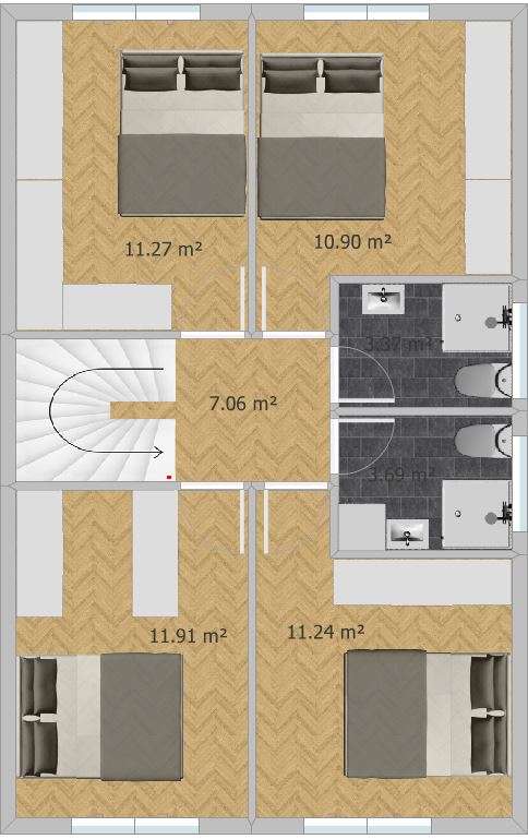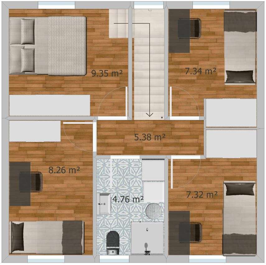Na katu su 4 sobice i jedno kupatilo s mašinom i sušilicom. Sobice su jako skromne kvadrature (ove dvije ispod 8m2, trebalo bi povećati da su min 8m2, a u skladu s time, malkice bi se povećale kuhinja i blagovaonica.