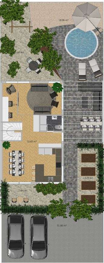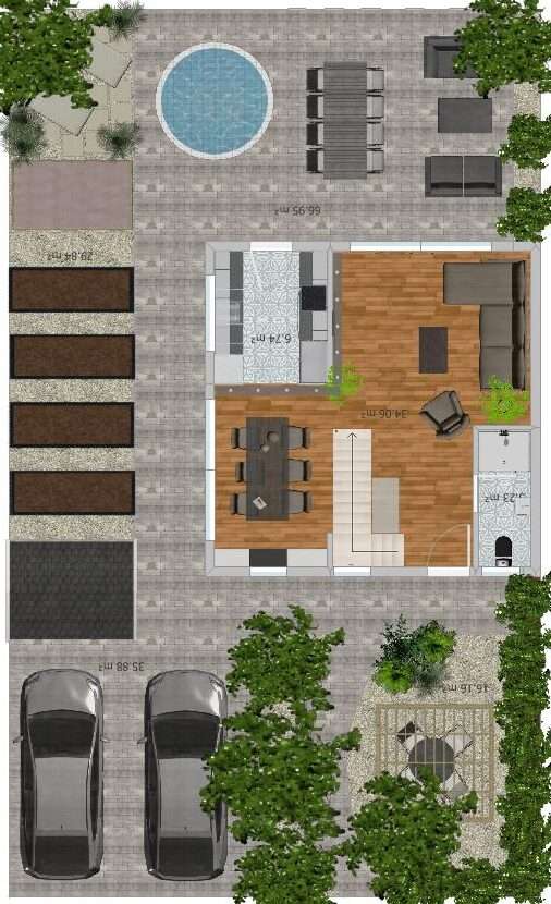 Ispred kuće je velika izbetonirana/ popločana površina za aute (i nema cigančenja kad imaš goste), a i za igranje kada je parking cijeli ili djelomično slobodan. Nakon toga su blago povišene izbetonirane gredice za biljke (živicu) kako bi se čim više zaštitilo dvorište i prozori od ulice i ispušnih plinova. Slijeva se nalazi jedna intimna pošljunčana terasica na koju se izlazi iz blagovaonice. Zdesna je dio s nekoliko gredica koji je djelomično zaklonjen pergolom i kućom od sunca koje prži ljeti. Od susjeda je odijeljen zelenilom što je opet dodatna površina za sadnju. Pod pergolom je vanjski boravak, a u nastavku lijep vanjski prostor za odmor i igru. Prostor je podijeljen na šljunčan, popločan, zemljan i pješčan dio. Dvorište je isplanirano i trebaš samo redovno održavati- ni brige ni pameti.
