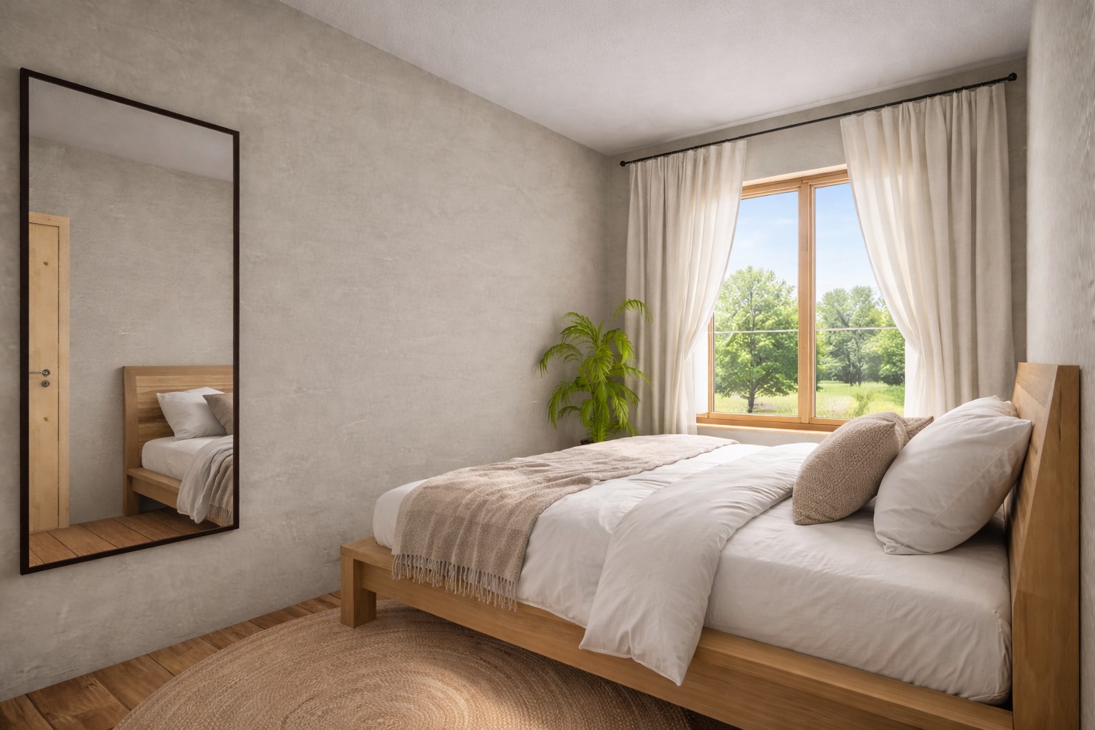 Namještaj je trebao biti drven i, općenito, od prirodnih materijala, po mogućnosti već spreman za nabavku i dostupan u dućanima. To je ispunjeno- niti jedan komad nije rađen po mjeri, većina namještaja kupljena je u.. vidi se iz aviona, al neću ih džabe reklamirati. Neki komadi namještaja nisu identični kao na renderu- jer ih nije bilo za kupiti pa smo se prilagodili. Također, neke stvari nije bilo moguće prikazati renderom, ali su bili ideja otpočetka- kao npr. baldahin u ćošku.