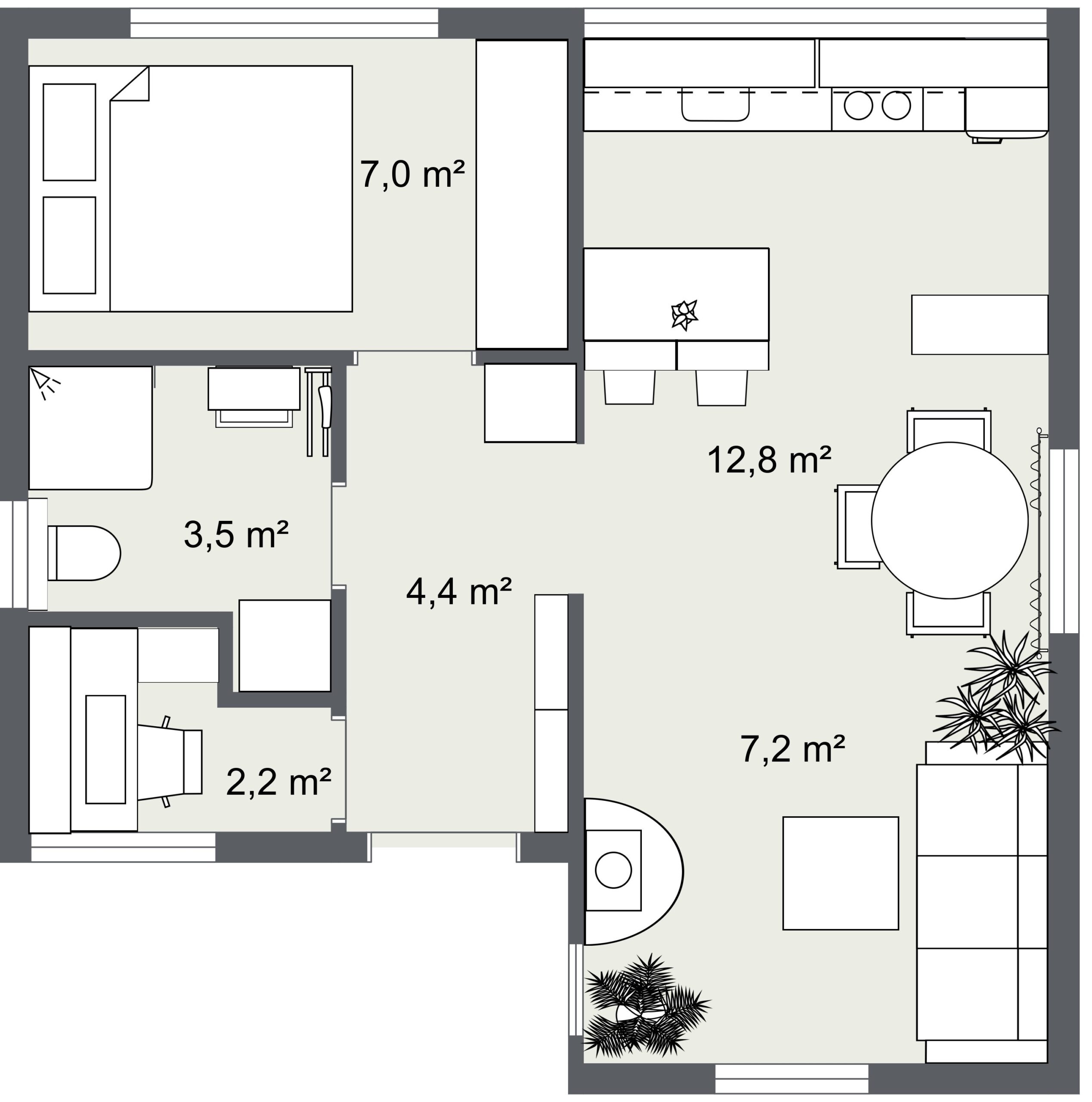 Jednostavan tlocrt kućice koja ima sve potrebno za i više nego ugodan život dvoje ljudi, a kraljevski ugodan život samca. Ova kućica 37 m2 veličine ima čak i malu radnu sobicu i više od 2m dužine ormara. U ovom malom prostoru stala je čak i velika kuhinja sa šankom.