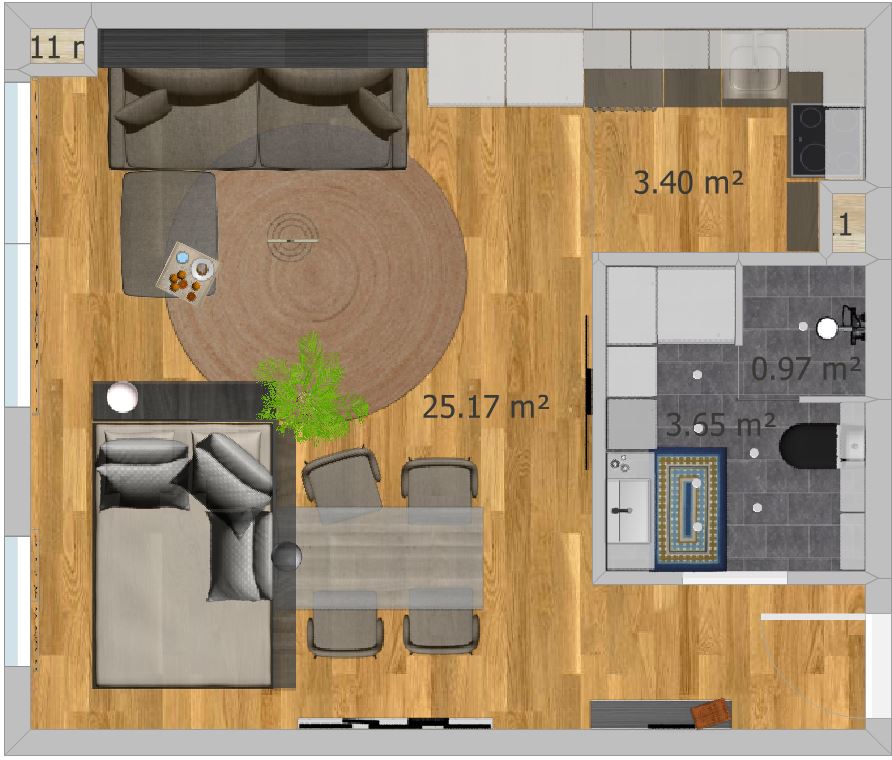 Ovo je tlocrt kompletno uređene garsonijere veličine 33 kvadrata. Stan ima jednu prostoriju, na sreću, jako dobro osvjetljenu, uvučenu kuhinju i kupatilo. Po mom skromnom mišljenju, bolje da je kuhinja dobila još djelićak prostora nauštrb kupatila.
