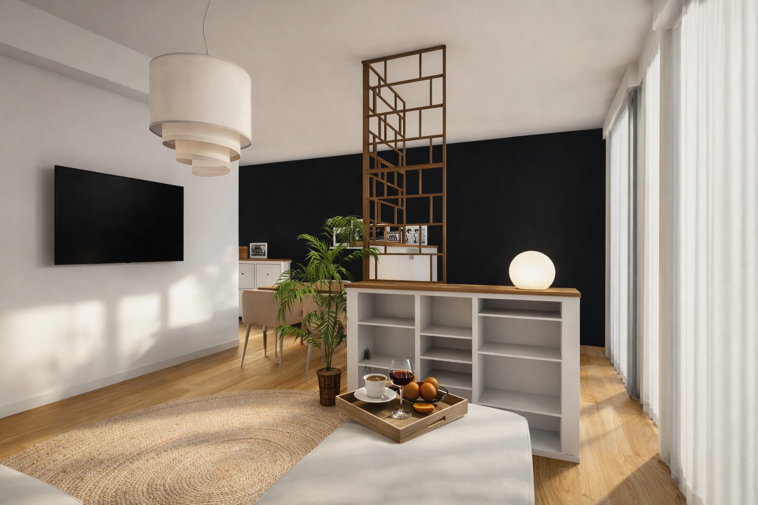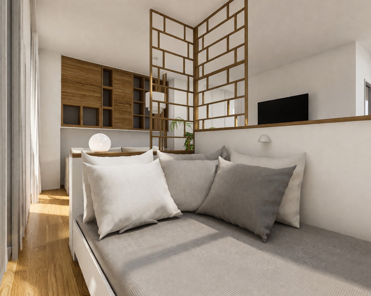 Ovaj stančić idealan je za studenta/ samca/ mladi par koji može skupa u malom prostoru. Iako je samo jedna prostorija koja je praktički sve, pokušala sam zonirati i staviti čak i krevet, ali bez klasičnog pregrađivanja već s nekim kerefekama. Kako često kažem, nije mala kvadratura nužno kriva što se ne može napraviti više i bolje nego tlocrt.